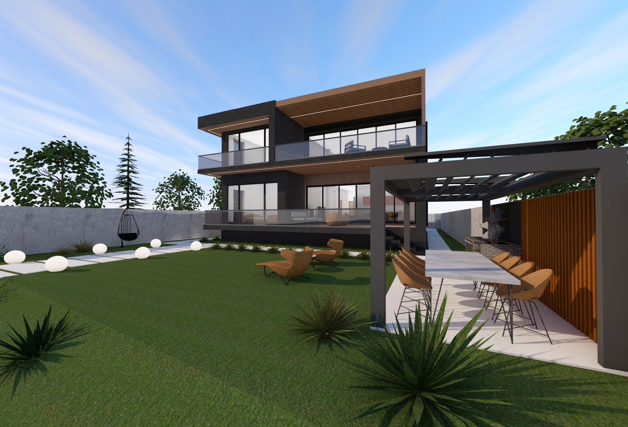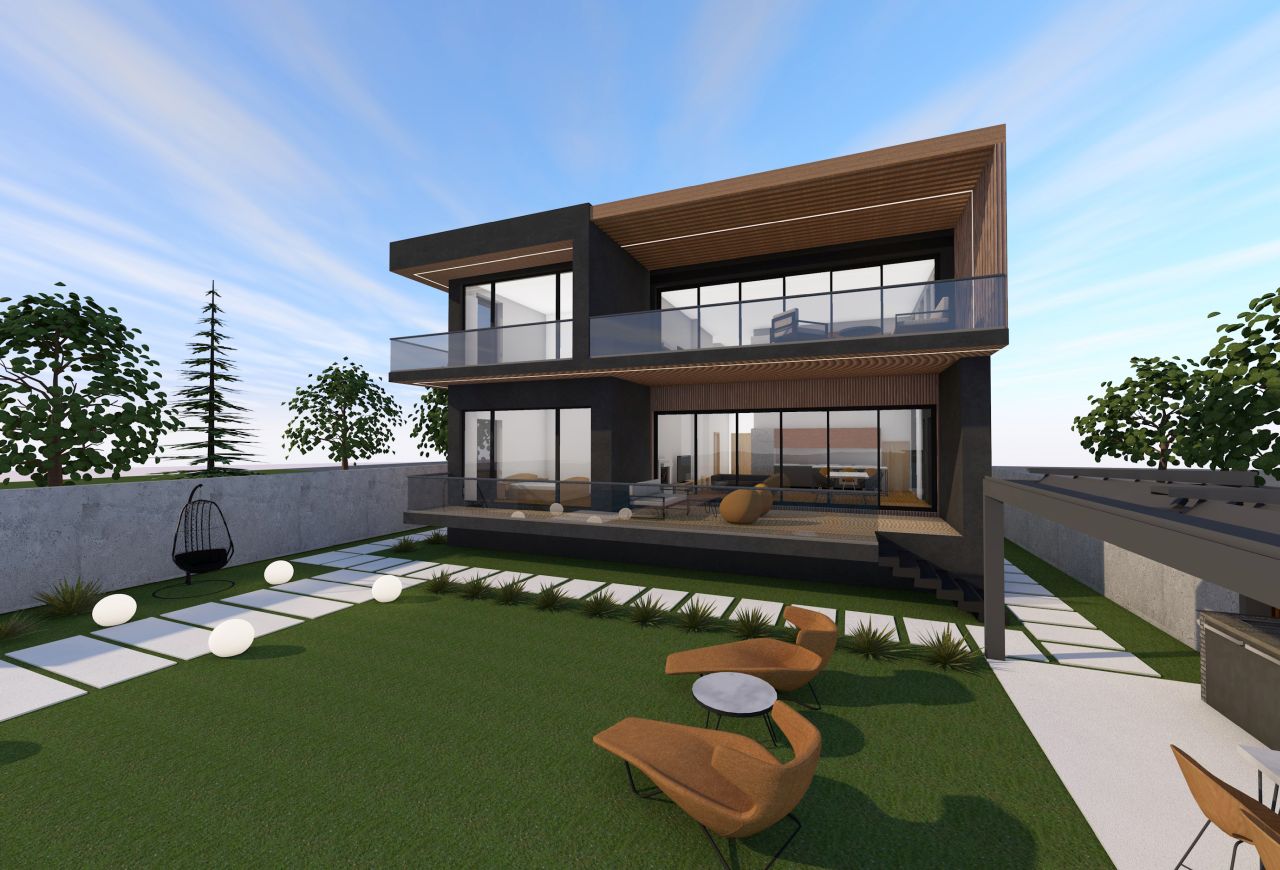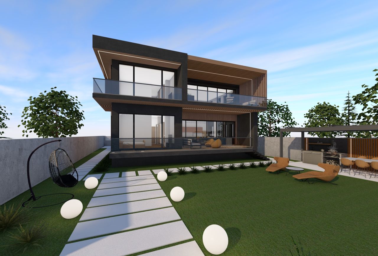Locuința de la etaj este accesată printr-o scară metalică exterioară amplasată în lateralul imobilului, in dreapta accesului principal, delimitată de panouri de riflaje verticale din lemn care se continuă și la nivelul terasei. Din punct de vedere al materialității, am utilizat o tencuială decorativă gri, cu aspect betonat, la care am intervenit cu panouri compozite din lemn la nivelul teraselor și ferestrelor pentru a oferi contrast la nivelul fatadelor si pentru a le pune in valoare mai bine la nivel exterior.