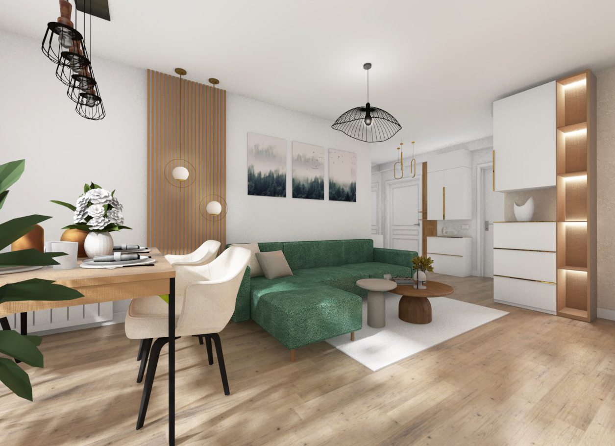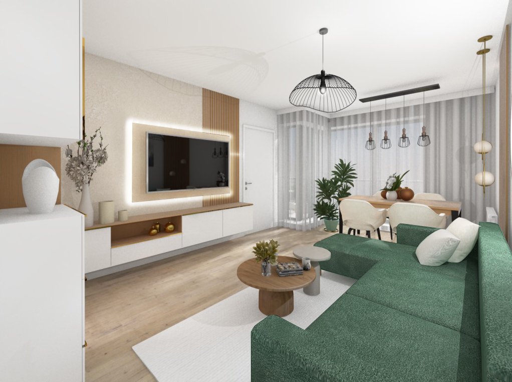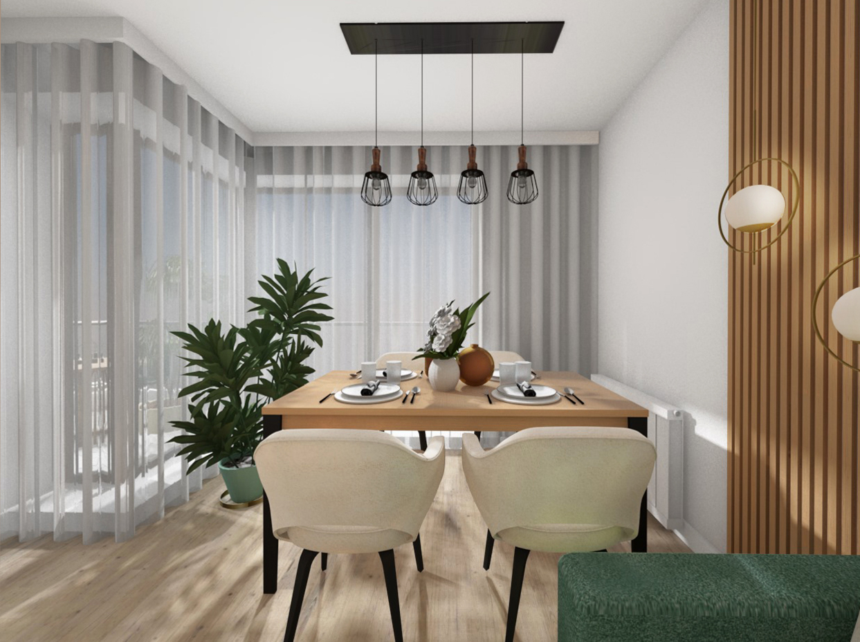 Living-roomul este piesă principală a locuinței și cea de relaxare, în care am integrat o comodă TV și o bibliotecă cu rafturi vizibile pe peretele adiacent, pentru a nu încărca prea mult spațiul. În apropierea ferestrei am poziționat masa de dining, care primește destul de multă lumină în colțul din apropierea terasei. Pentru a nu încărca cu decor prea mult încăperile, am recurs la draperii albe, simple, care măresc vizual și luminează spațiile.