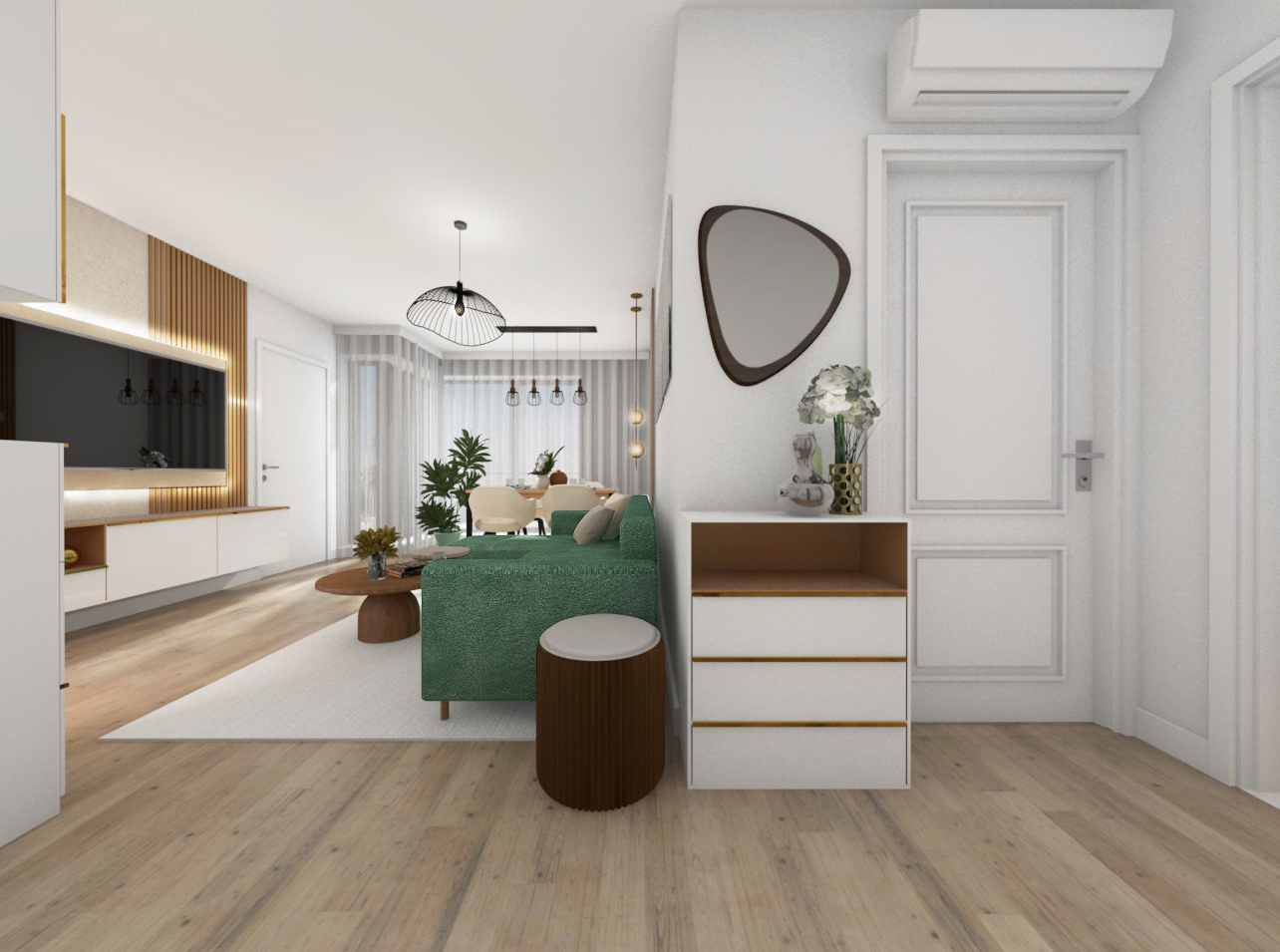 În cadrul acestei amenajări, am urmărit crearea unei atmosfere de relaxare, deschise, simple prin alegerea materialelor și a obiectelor ce compun încăperile, mizând mai mult pe tonalități neutre și cu un accent de culoare oliv, pe care îl regăsim în elementele de mobilier ce conturează amenajarea. Apartamentul este compus dintr-un living, bucătărie, dormitor matrimonial, birou, două băi precum și două terase: una închisă cu sticlă, accesibilă din bucătărie și living și celelalte deschise, accesibile din dormitoare.