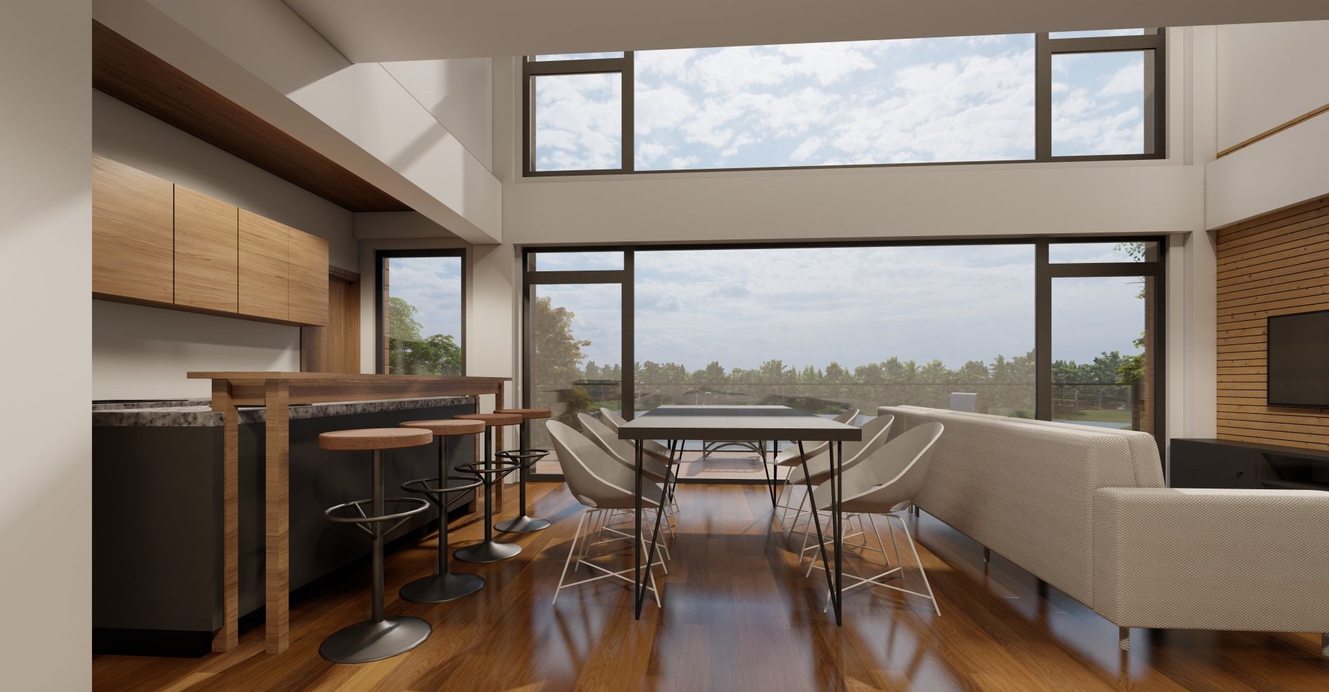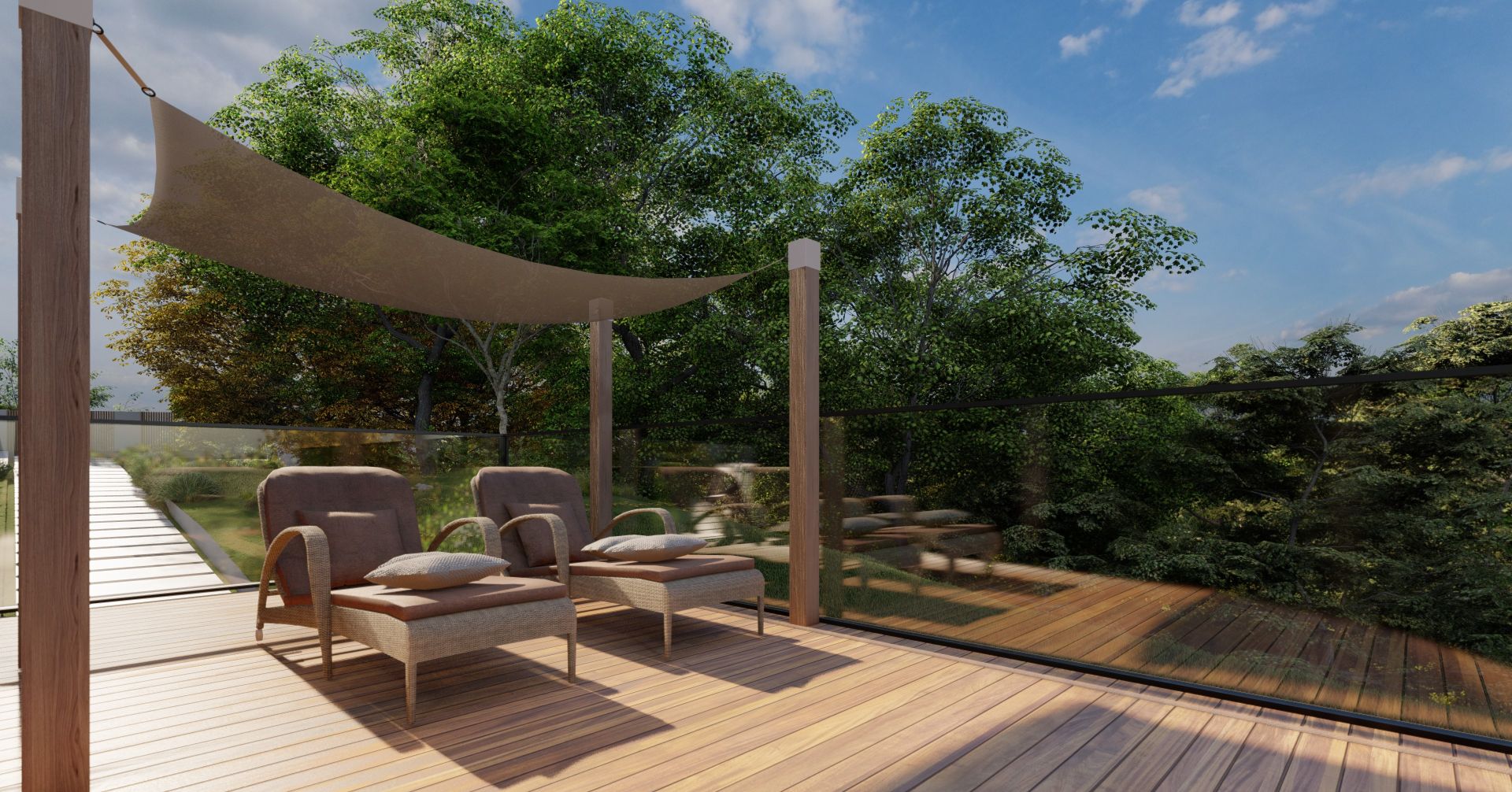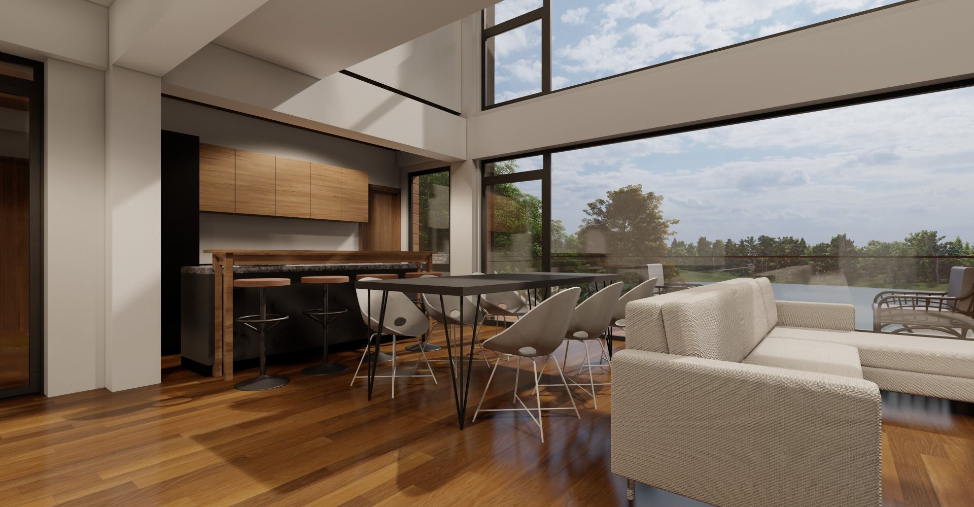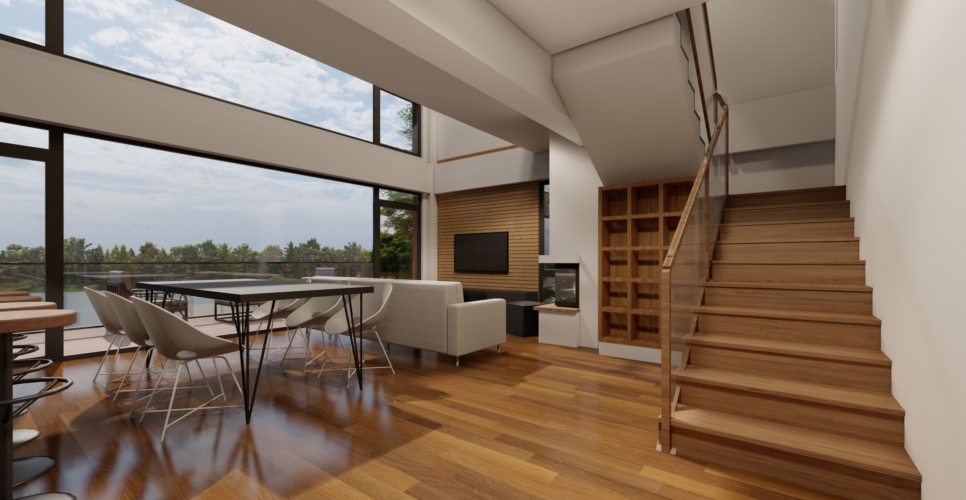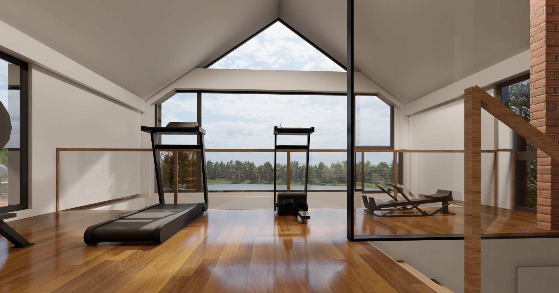 La etaj, locuinta cuprinde doua dormitoare orientate catre est, benefiind de primele raze ale soarelui, grup sanitar, dressing si o sala de fitness orientata catre lac. De la etaj se realizeaza un acces pe o terasa descoperita deasupra intrarii principale in locuinta. Locuinta mai cuprinde si un foisor deschis, amenajat catre fundul lotului, catre lac, cu o bucatarie de vara si o zona de dining.