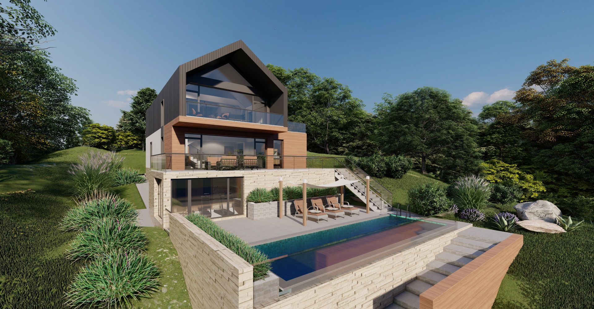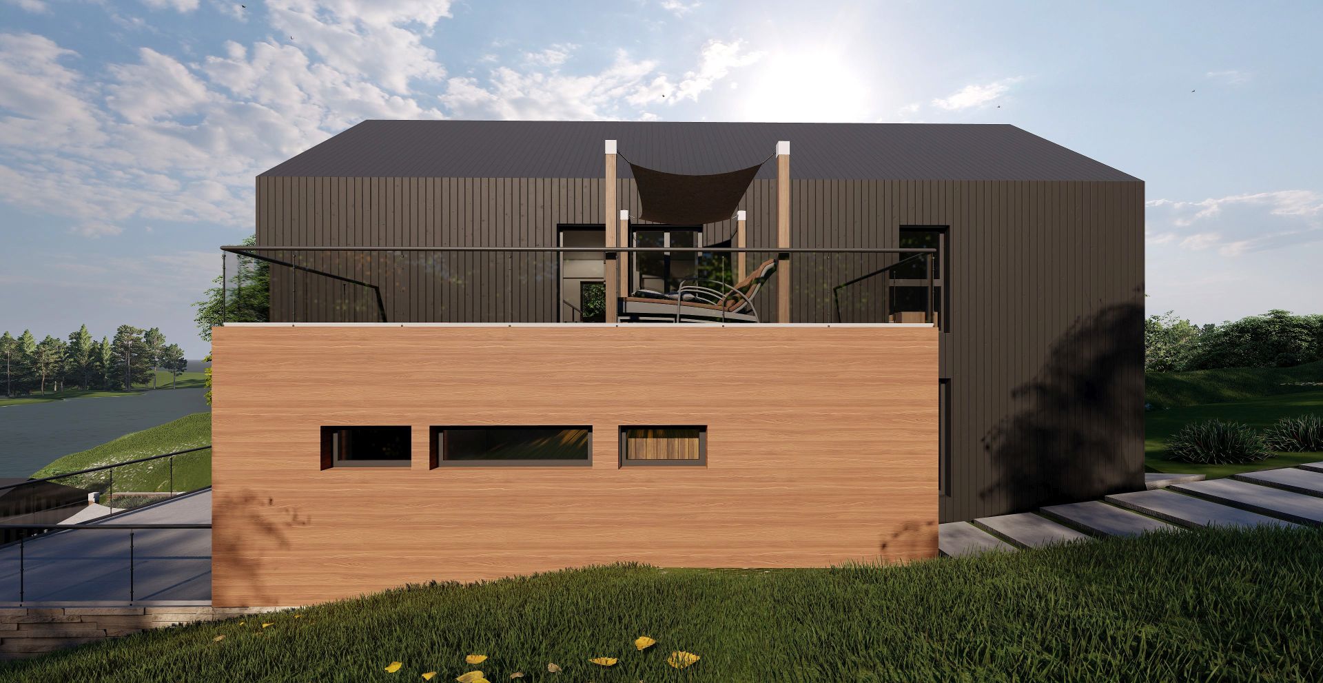 Pentru ca volumetria sa nu para prea rigida, in anumite zone am tratat fatada cu panouri de lemn, un material cald si natural, iar in zona socului, la partea de contact cu terenul, anumite accente de piatra naturala de Baschioi. Volumetria este simpla, compacta, mizand mai mult pe materialitati diferite in zona soclului si a parterului si pe iesirea in consola a etajului 1.