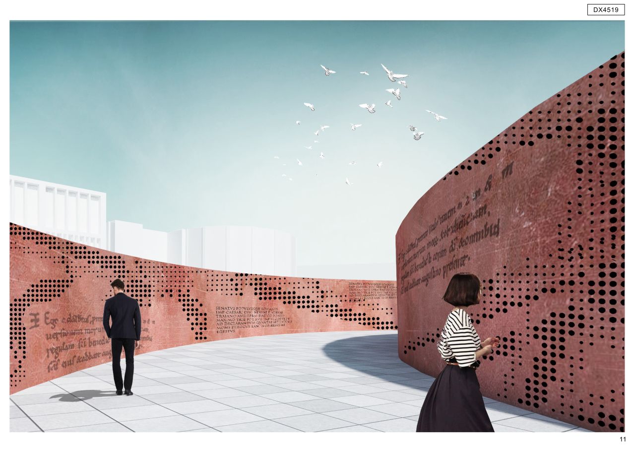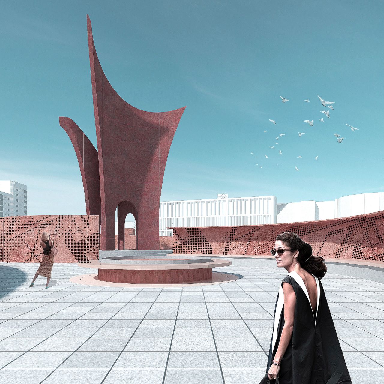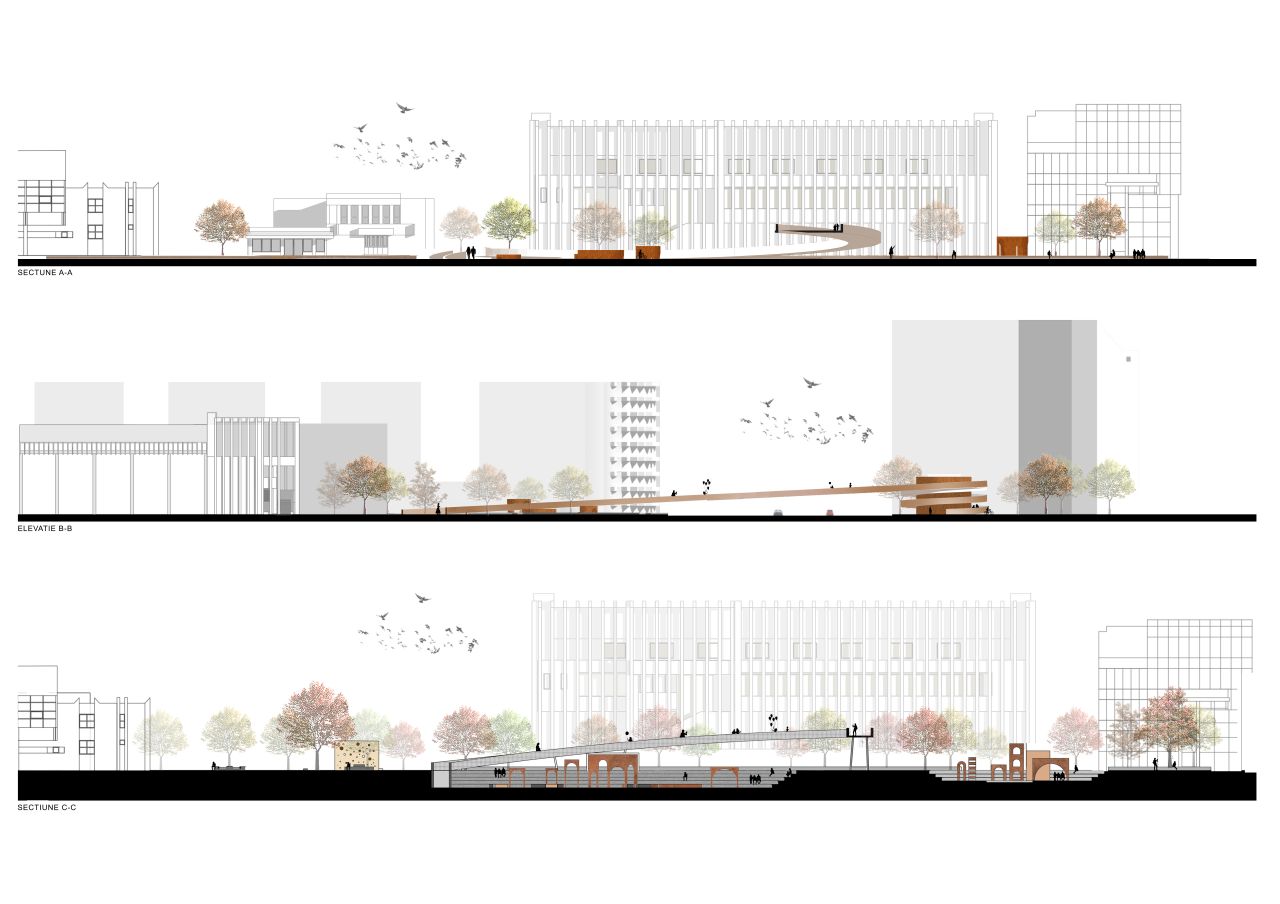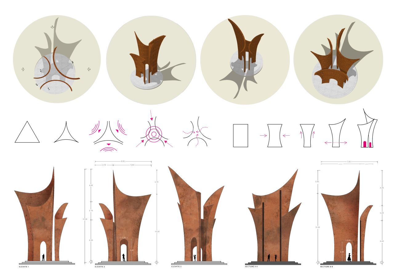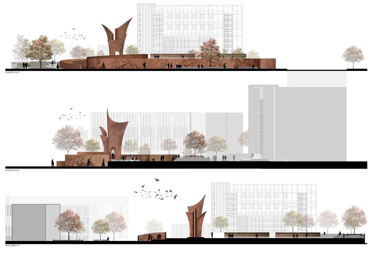 Spațiul din fața băncii BCR devine piața monumentală, fiind definită de un traseu spațial care te invită să îl parcurgi și să îl descifrezi, iar la final, într-un mod simbolic, să interacționezi cu obiectul sculptural și să îl străbați.